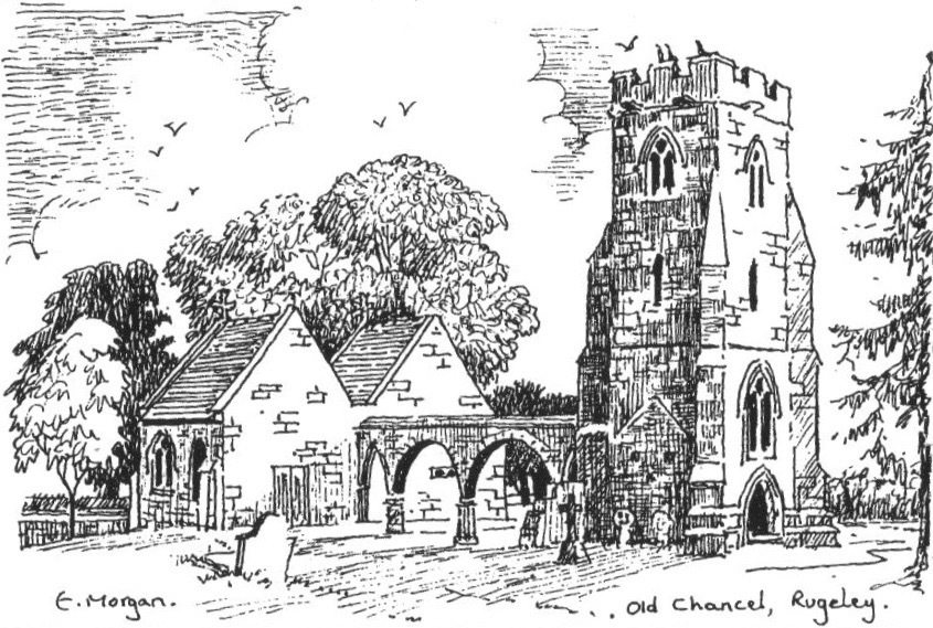 View of Rugeley from the A51 bypass showing St Joseph & St Etheldreda (R.C.) steeple and the towers of St Augustines (C. of E.) and the 'Old Chancel' churches.